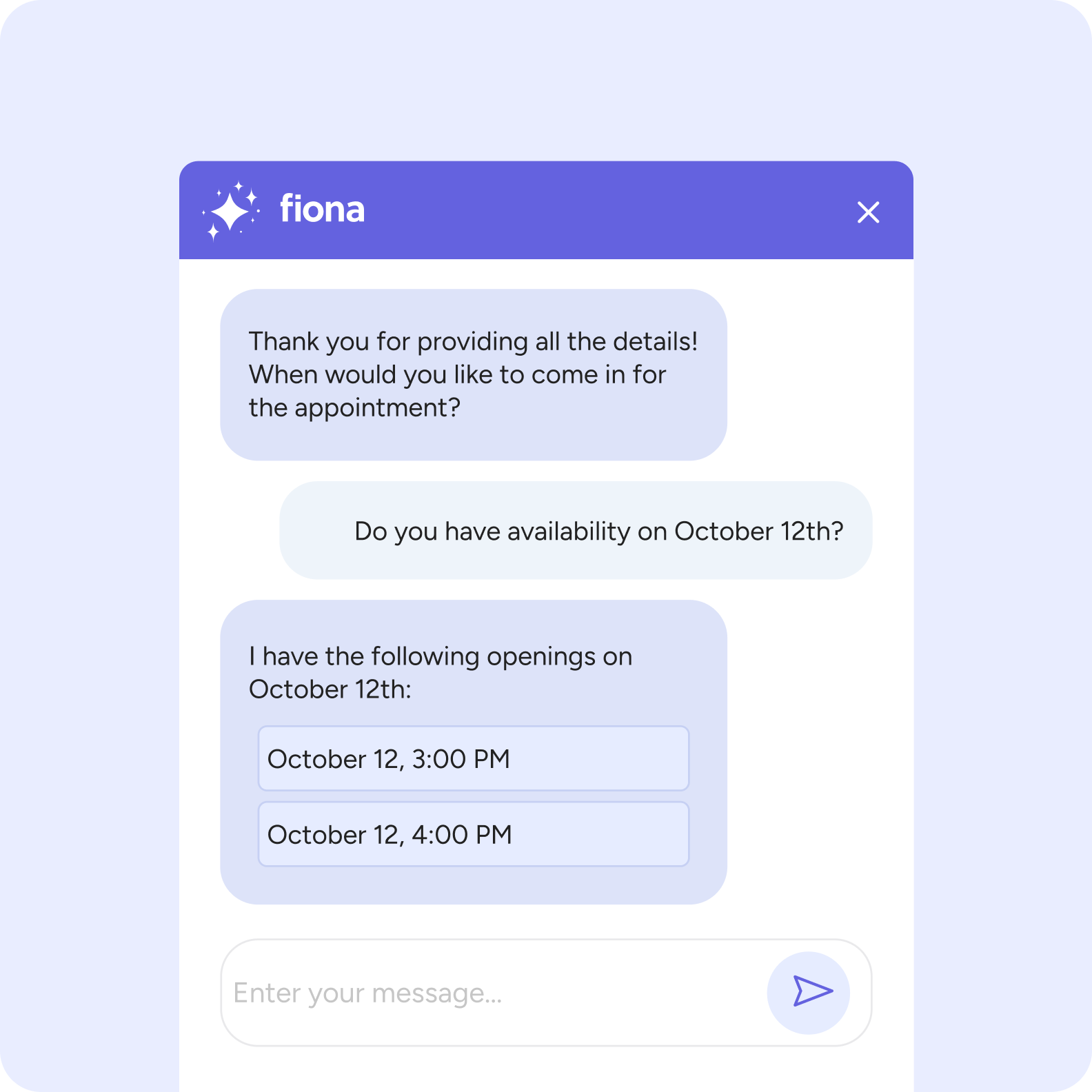 "Fiona completely changed my experience with AI. She was very pleasant and helpful. I had 3 children to schedule and she kept up with me. I was blown away. It kinda scared me how good it was. I really appreciated it, it was very pleasant and got the job done. 10/10!"