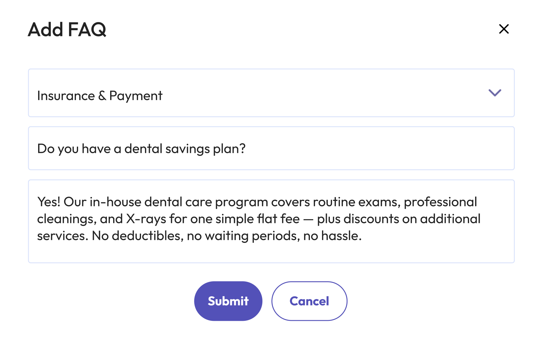 Fiona knows your practice inside and out. Hours, services, insurance accepted, providers, pricing. She answers patient questions accurately and consistently every time, without putting anyone on hold to track down an answer.