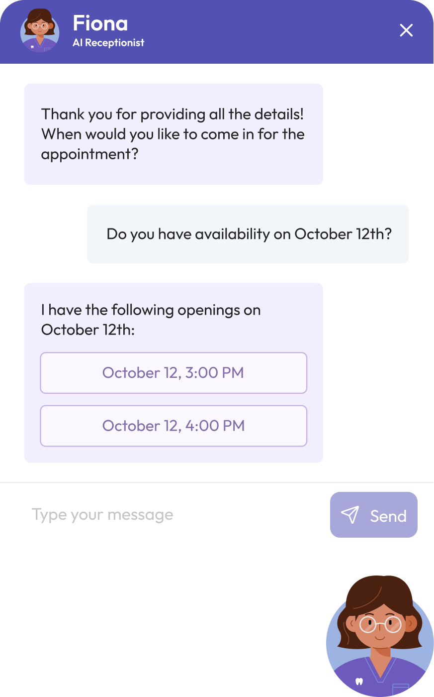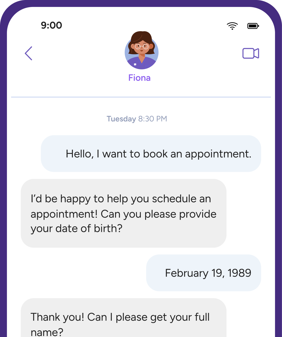 Fiona answers during office hours, after hours, and the busiest parts of your day. Whether a patient is booking for the first time or calling about an existing appointment, she handles it completely, so your front desk can stay focused on the person standing in front of them.